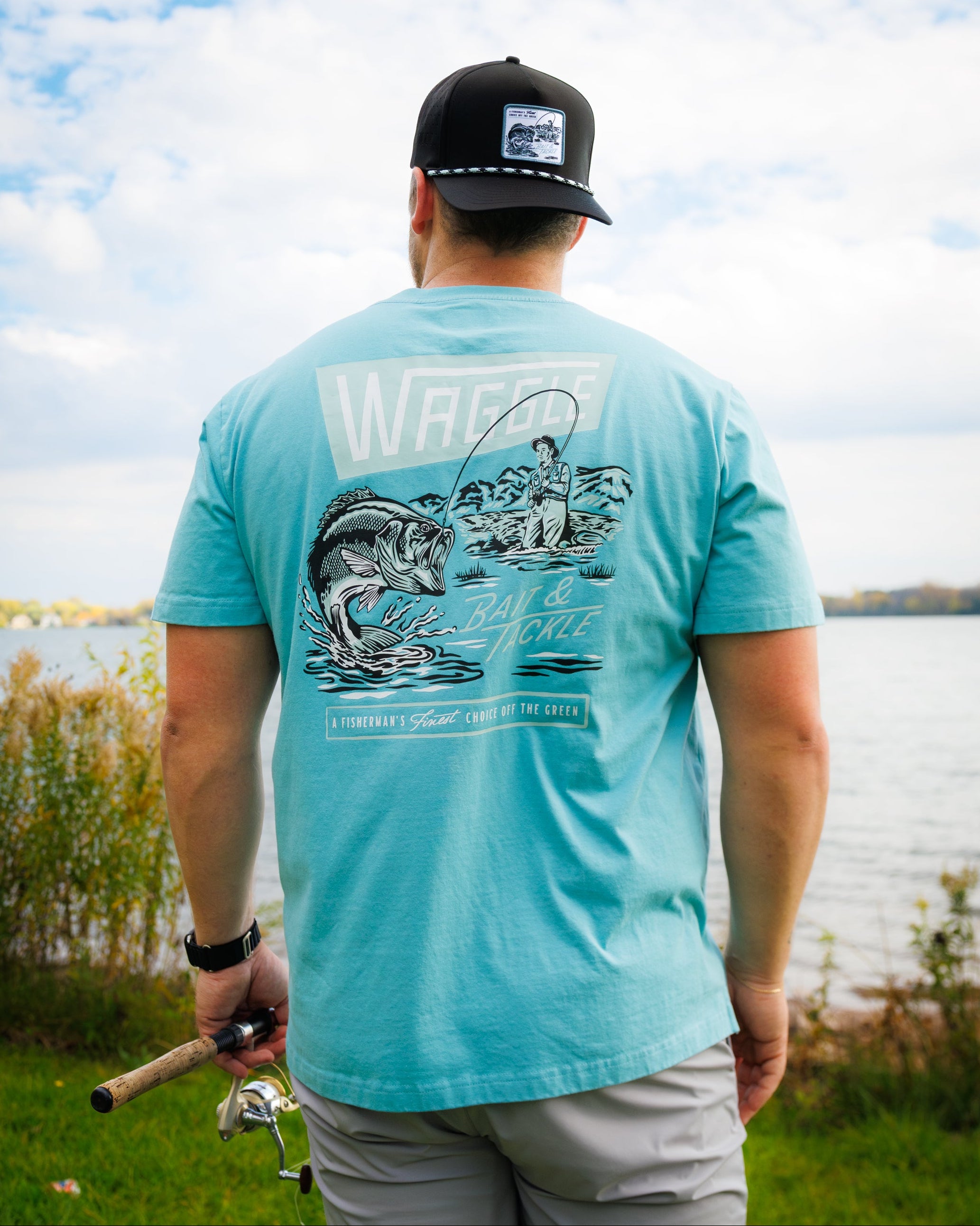 From the freshwater to the fairway. If your fun money is divided between the pro shop and the bait shop, the Waggle Bait & Tackle fishing t-shirt is your go-to for catching a reel good time.